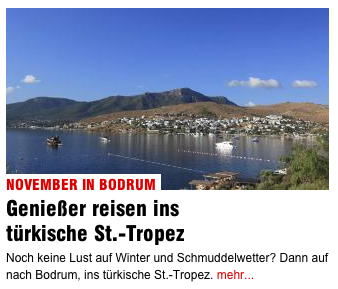 Kasım ayında tatil yapılacak ideal yer olarak ve “Türk St. Tropez’i” yakıştırmasıyla Bodrum’un tanıtımı vardı Bild’de.