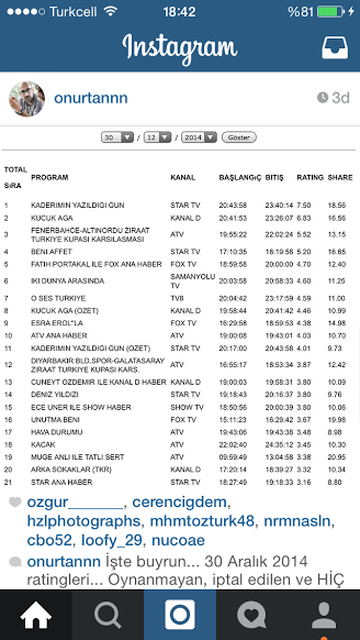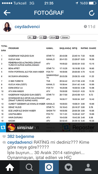 “İşte buyrun. 30 Aralık 2014 reytingleri. Oynanmayan, iptal edilen ve hiç yayınlanmayan maç başlangıç ve bitiş saatleriyle TNS reyting sisteminde sıralamada yer alabiliyor. Burası Türkiye. Sistem belli. Sıralama üç gün öncesinden zaten çıkıyor. Bu dolandırıcılığı yapan ve sistemi kendi çıkarları doğrultusunda kullanan insanlar da yanlışlıkla eski listeyi gönderiyor. Acı olan da kimsenin sesini çıkaramaması. Bu nedir diye her hangi bir açıklama sorulmaması.”