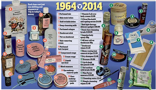 Bir tarafta 1964’ün, diğer yanda 2014’ün ürünleri ve fiyatları.