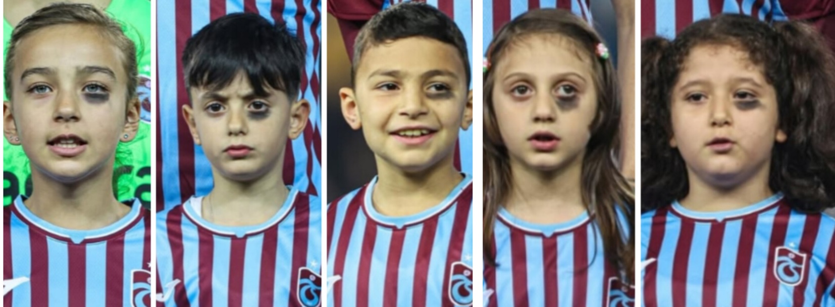 Hakemler ve futbolcularla birlikte sahaya çıkan minik Trabzonsporluların hepsinin sol gözünün altındaki siyah iz, 14 yaşında katledilen Trabzonspor taraftarı Mattia Ahmet Minguzzi gibiydi.