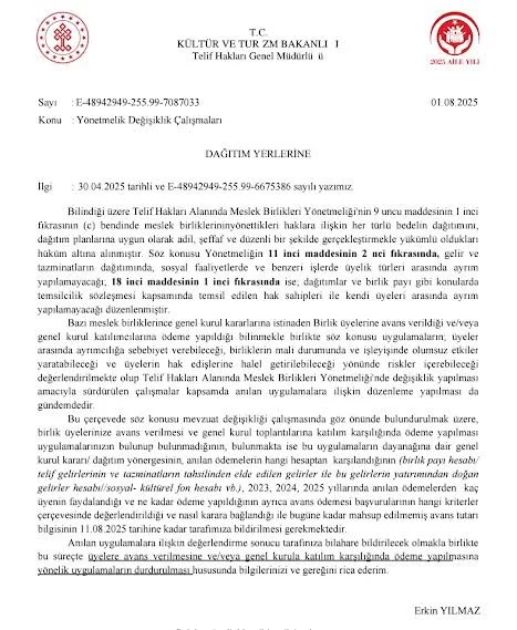 Kültür ve Turizm Bakanlığı Telif Hakları Genel Müdürü Erkin Yılmaz, MESAM, MSG ve MÜYORBİR’e gönderdiği yazıyla ‘avans’ ödemelerine “Dur” dedi: