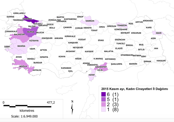 Ekim ayında öldürülen kadın sayısı 20 iken kasımda bu rakam 25’e çıktı. Kadın cinayetlerinden 6’sı İstanbul’da, 5’i Bursa’da işlendi. Balıkesir, Muğla ve Gaziantep 2’şer, Manisa, Kütahya, İzmir, Samsun, Hatay, Iğdır, Kocaeli ve Trabzon da birer kadın cinayetiyle girmiş listeye.
