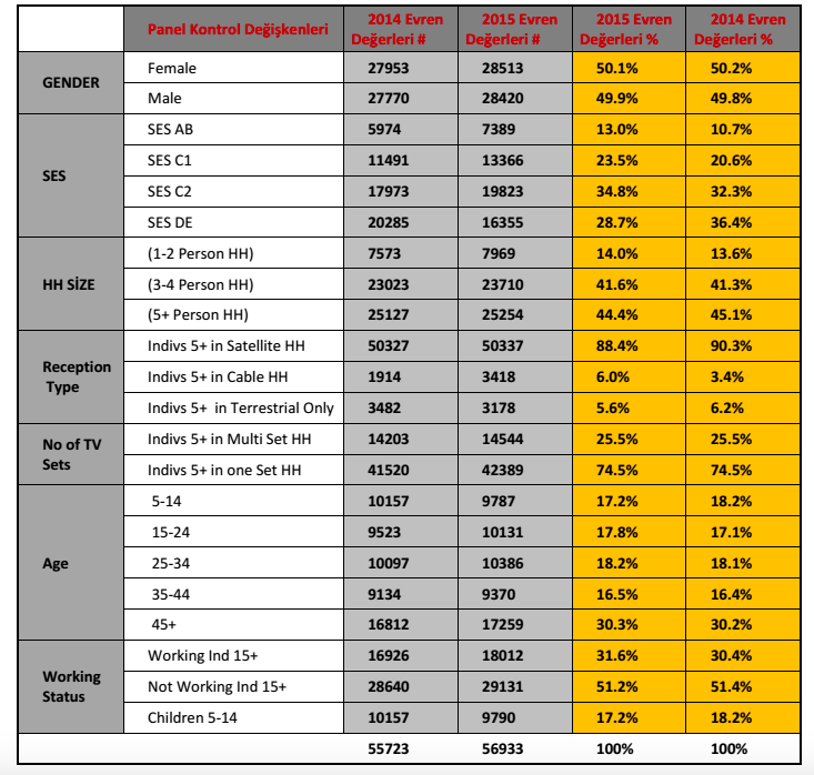 Reyting ölçümünün yapılacağı haneler ve SES ölçekleri de değişti. TÜİK’in verileri ışığında reyting hanelerindeki AB grubu yüzde 10.7’den yüzde 13’e çıktı, DE grubu ise yüzde 36.4’ten 28.7’ye düştü. C1 ve C2 grubunda da artışlar söz konusu.