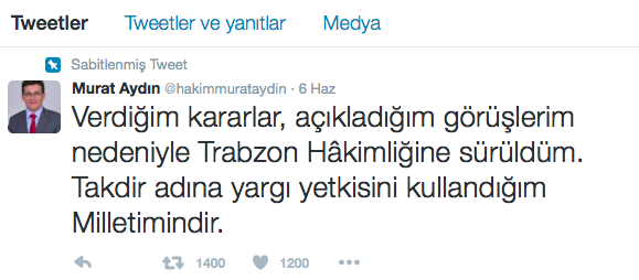 Kendisi gibi yargıç olan eşi Gülay Aydın’la Trabzon’a tayin edilen Murat Aydın’ın Twitter’dan yaptığı paylaşıma bakar mısınız?