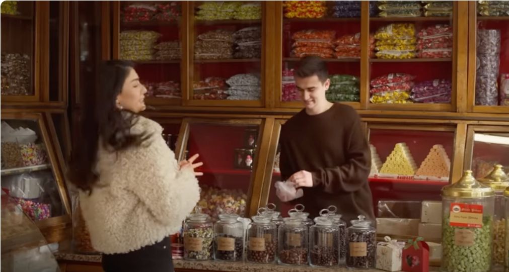 Senaryo gereği aynı şekerciye ‘İnci Taneleri’nin ‘Dilber’i Hazar Ergüçlü de gitti ve ‘Azem’ gibi aynı drajeleri seçti.